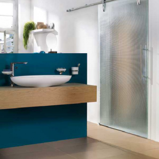 Einscheibensicherheitsglas (ESG), auch ornamentiert für Türfüllungen, insbesondere für Familien mit Kindern und älteren Menschen, um Schnittverletzungen zu vermeiden.
